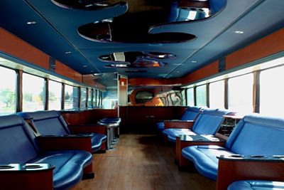 You'll find that this 30 passenger party bus is really and truly the pinnacle of luxury vehicles in it's class. She's equipped with exquisitely luxurious jet black leather seating that simply invites you to sit, relax, and enjoy true comfort. You'll also find a chrome reflective ceiling with LED and fiber optic mood lighting. Enjoy total privacy with both window shades, and dark limo tinted windows. Top it all off with a large HD television, audiophile sounds, and multiple bars filled to the brim with ice... Just waiting for your drinks.